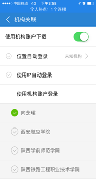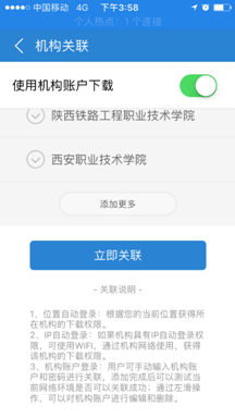 3)机构账户登录:手动输入机构账号名称、密码。(推荐)(首次关联需要在学校WIFI环境下,即在学校IP范围内进行关联)